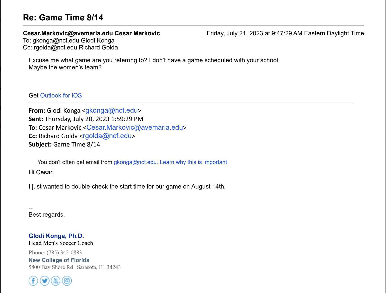 Is someone from Florida trying to sell you a timeshare and/or spot on the New College of Florida’s athletic team roster?